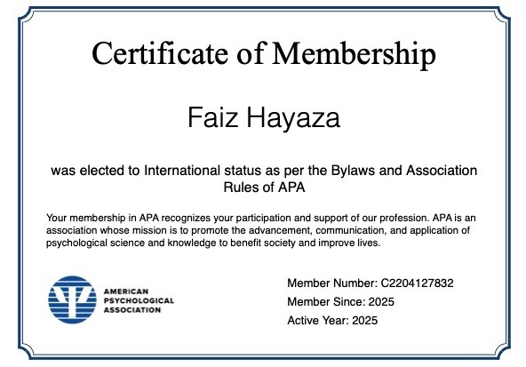 Saya secara resmi memiliki izin praktik sebagai psikolog klinis di Indonesia (bersertifikat SIPPK & STRPK), dan saya juga merupakan Anggota Internasional aktif dari American Psychological Association (APA). Kredensial ini mencerminkan komitmen saya terhadap standar profesional, baik di tingkat nasional maupun internasional.