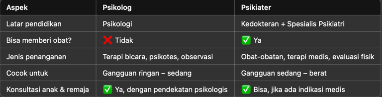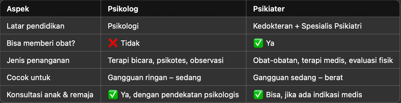 Psikolog adalah “pintu awal” untuk memahami masalah emosional dan perilaku Anda. Jika diperlukan pengobatan atau ada dugaan masalah pada fungsi otak, barulah psikiater akan dilibatkan.